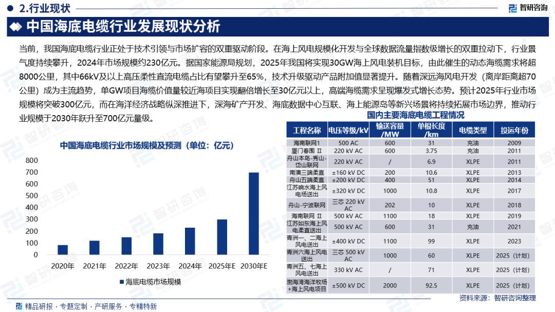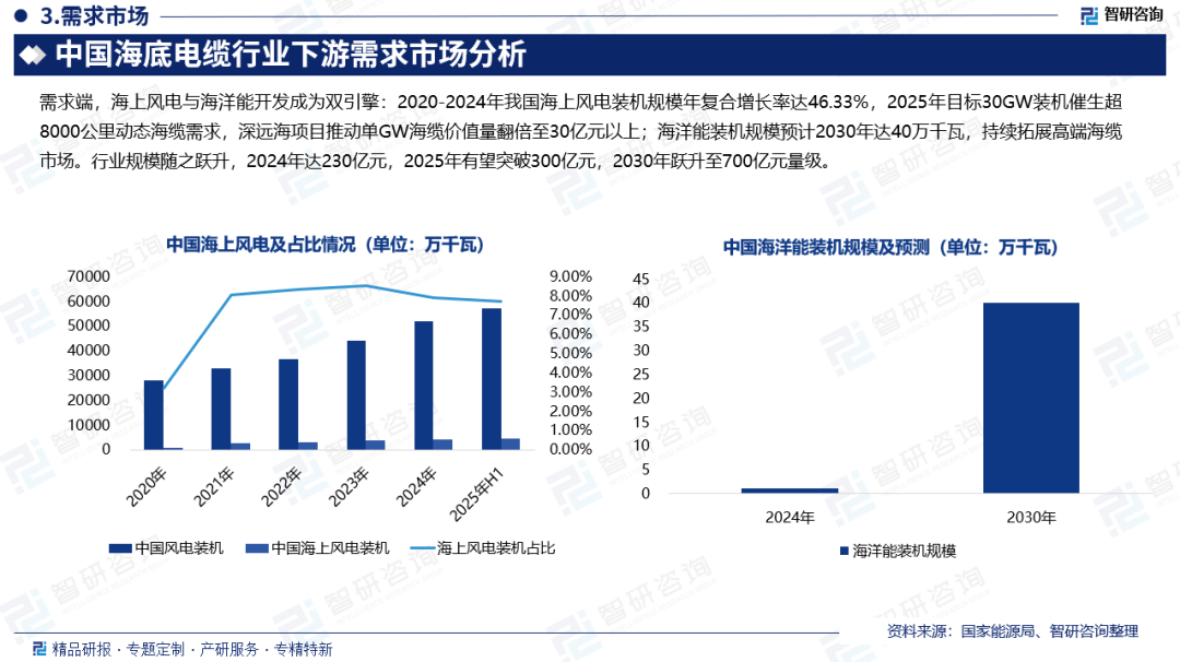 行业规模:当前,我国海底电缆行业正处于技术引领与市场扩容的双重驱动阶段。在海上风电规模化开发与全球数据流量指数级增长的双重拉动下,行业景气度持续攀升,2024年市场规模约230亿元。据国家能源局规划,2025年我国将实现30GW海上风电装机目标,由此催生的动态海缆需求将超8000公里,其中66kV及以上高压柔性直流电缆占比有望攀升至65%,技术升级驱动产品附加值显著提升。随着深远海风电开发(离岸距离超70公里)成为主流趋势,单GW项目海缆价值量较近海项目实现翻倍增长至30亿元以上,高端海缆需求呈现爆发式增长态势。预计2025年行业市场规模将突破300亿元,而在海洋经济战略纵深推进下,深海矿产开发、海底数据中心互联、海上能源岛等新兴场景将持续拓展市场边界,推动行业规模于2030年跃升至700亿元量级。