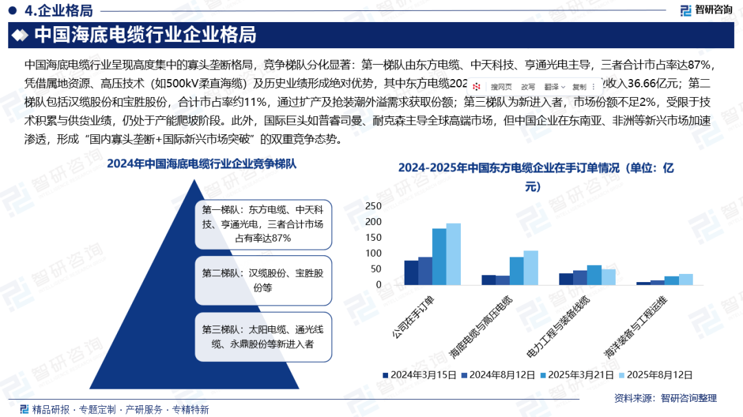 企业竞争格局:中国海底电缆行业呈现高度集中的寡头垄断格局,竞争梯队分化显著:第一梯队由东方电缆、中天科技、亨通光电主导,三者合计市占率达87%,凭借属地资源、高压技术(如500kV柔直海缆)及历史业绩形成绝对优势,其中东方电缆2024年海缆系统及海洋工程营业收入36.66亿元;第二梯队包括汉缆股份和宝胜股份,合计市占率约11%,通过扩产及抢装潮外溢需求获取份额;第三梯队为新进入者,市场份额不足2%,受限于技术积累与供货业绩,仍处于产能爬坡阶段。此外,国际巨头如普睿司曼、耐克森主导全球高端市场,但中国企业在东南亚、非洲等新兴市场加速渗透,形成“国内寡头垄断+国际新兴市场突破”的双重竞争态势。